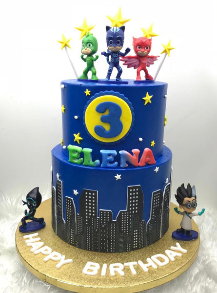 Cake + Authentic PJ Masks Collectible Figurine SetThis cake is iced with a smooth and not-so-sweet...