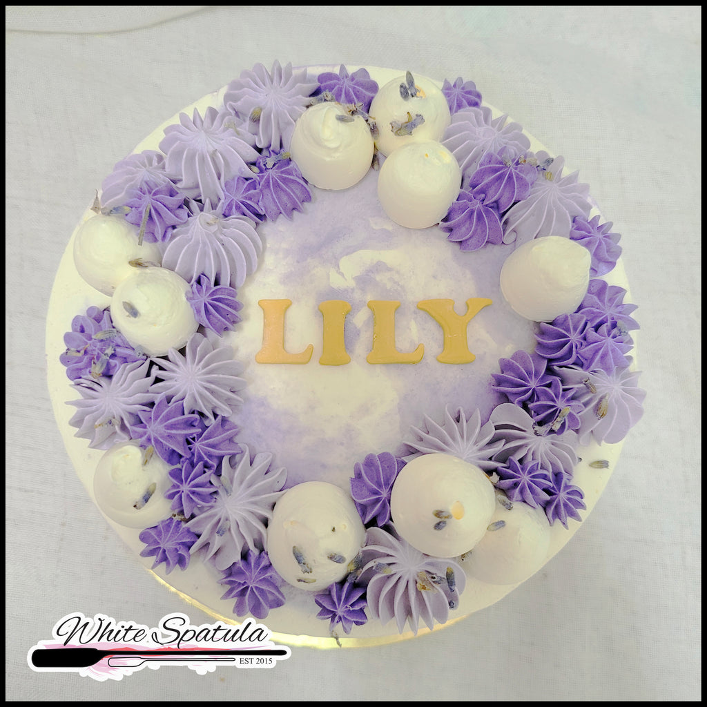 Earl grey and lavender infused cake, with lavender-perfumed rosettes, bringing a subtle tea and floral flavour to the cake! Every lady's favourite!