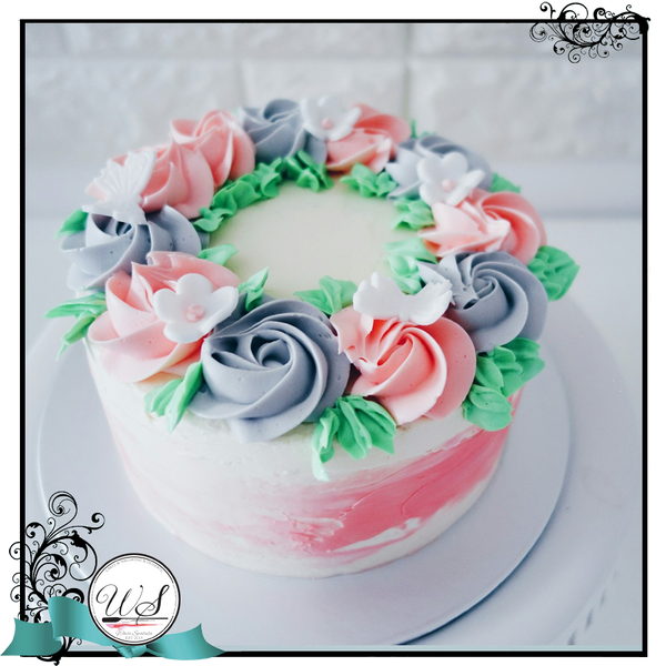 Floral Wreath (Pink) CakeThis cake is frosted with a smooth and not-so-sweet vanilla buttercream, with specially hand-piped pretty buttercream...
