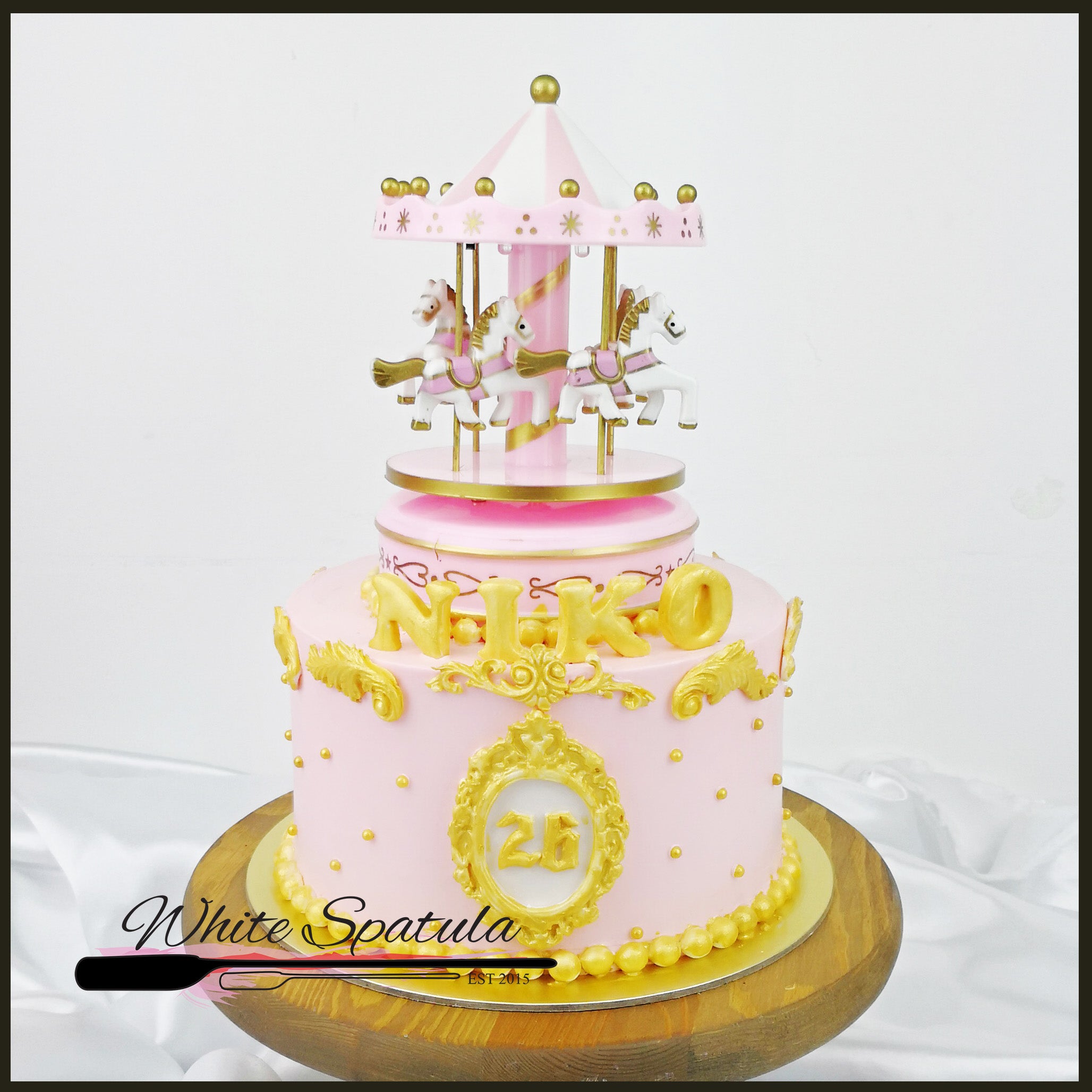 This cake is iced with a smooth and not-so-sweet vanilla buttercream and comes with a Carousel topper. The Carousel topper is a musical box and can be preserved as toy. Call us at 9666-7033 to find out more.