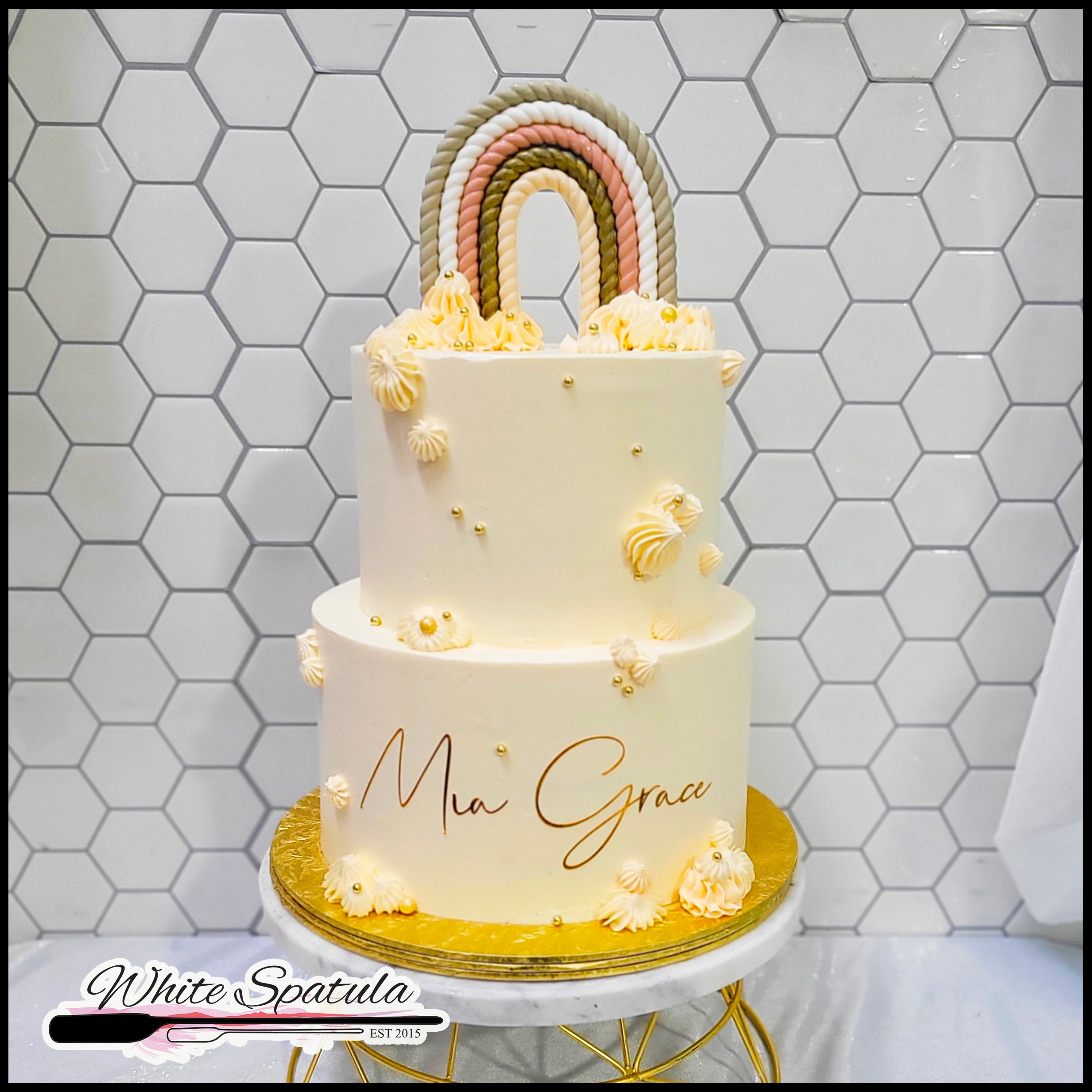 Every girl will fall in love with this simple and elegant Boho Rainbow cake! This cake is created at our local bakery in Singapore and iced with smooth and not-so-sweet vanilla buttercream. Decorations in the photo are included.