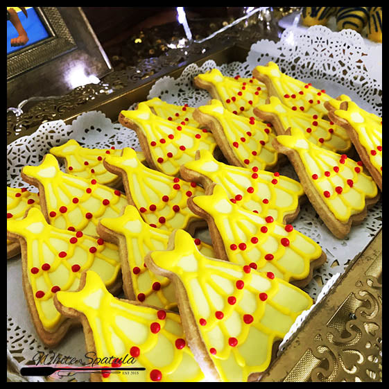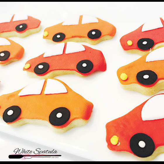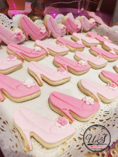 Our classic butter sugar cookies coated with handcrafted fondant / royal icing design! In all kinds of customized colours and shapes to fit any theme. Great on a dessert table, or as door gifts/party favours!