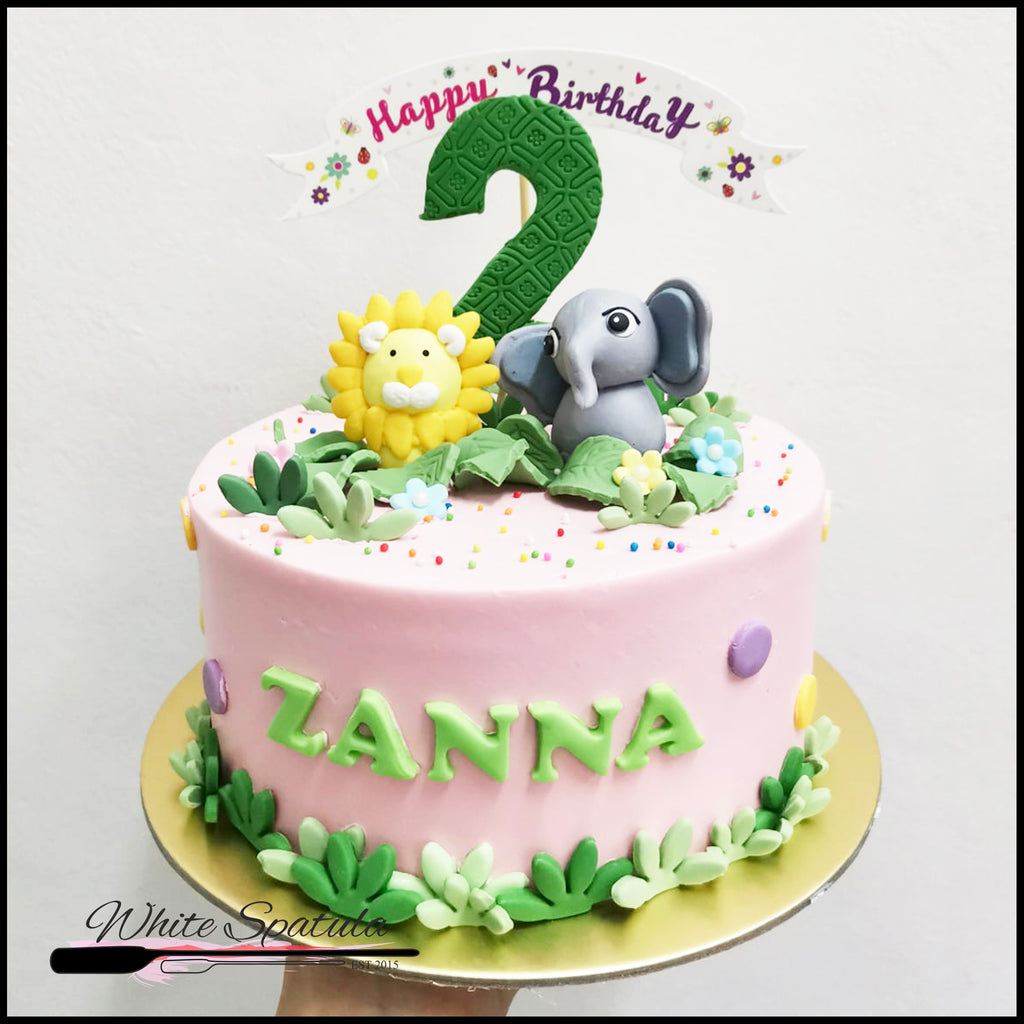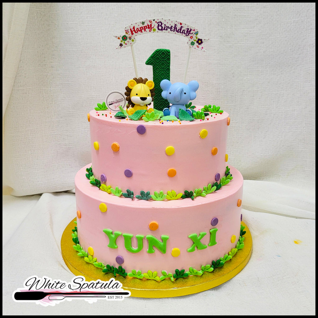 This cake is iced with a smooth and not-so-sweet vanilla buttercream and comes with 2 safari animals. Choose Design A (Lion or Elephant) or Design B (Giraffe and Tiger).