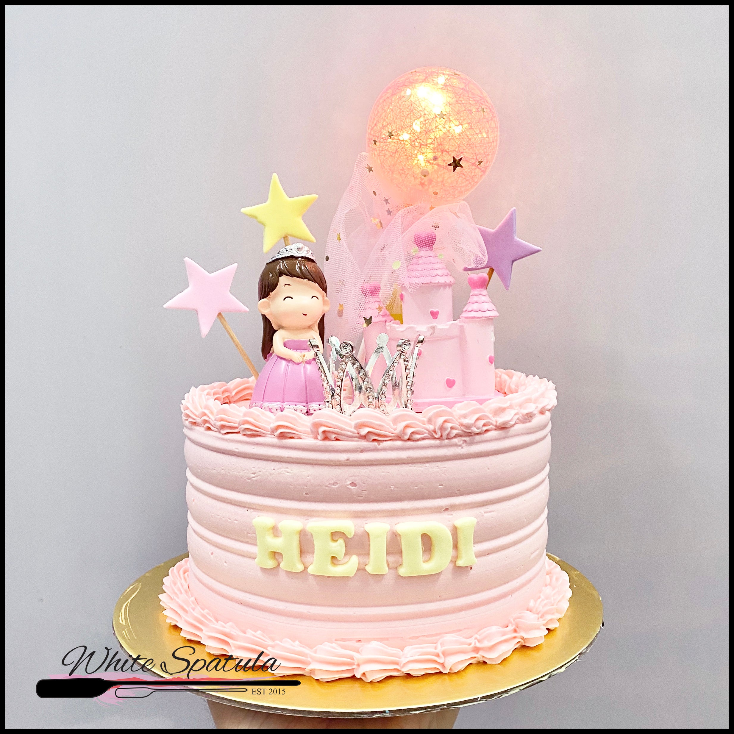 This cake is frosted with a smooth and not-so-sweet vanilla buttercream. Cutie Princess and her little castle can be kept as a toy. The light behind the castle lighten up the whole cake!