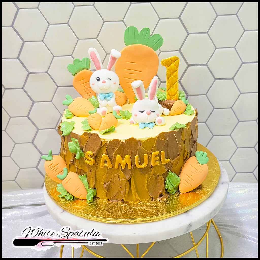 This cake is iced with a smooth and not-so-sweet vanilla buttercream and comes with fondant Rabbit character as part of the design. Nobody would resist a picture with this cute little bunny cake in your party!