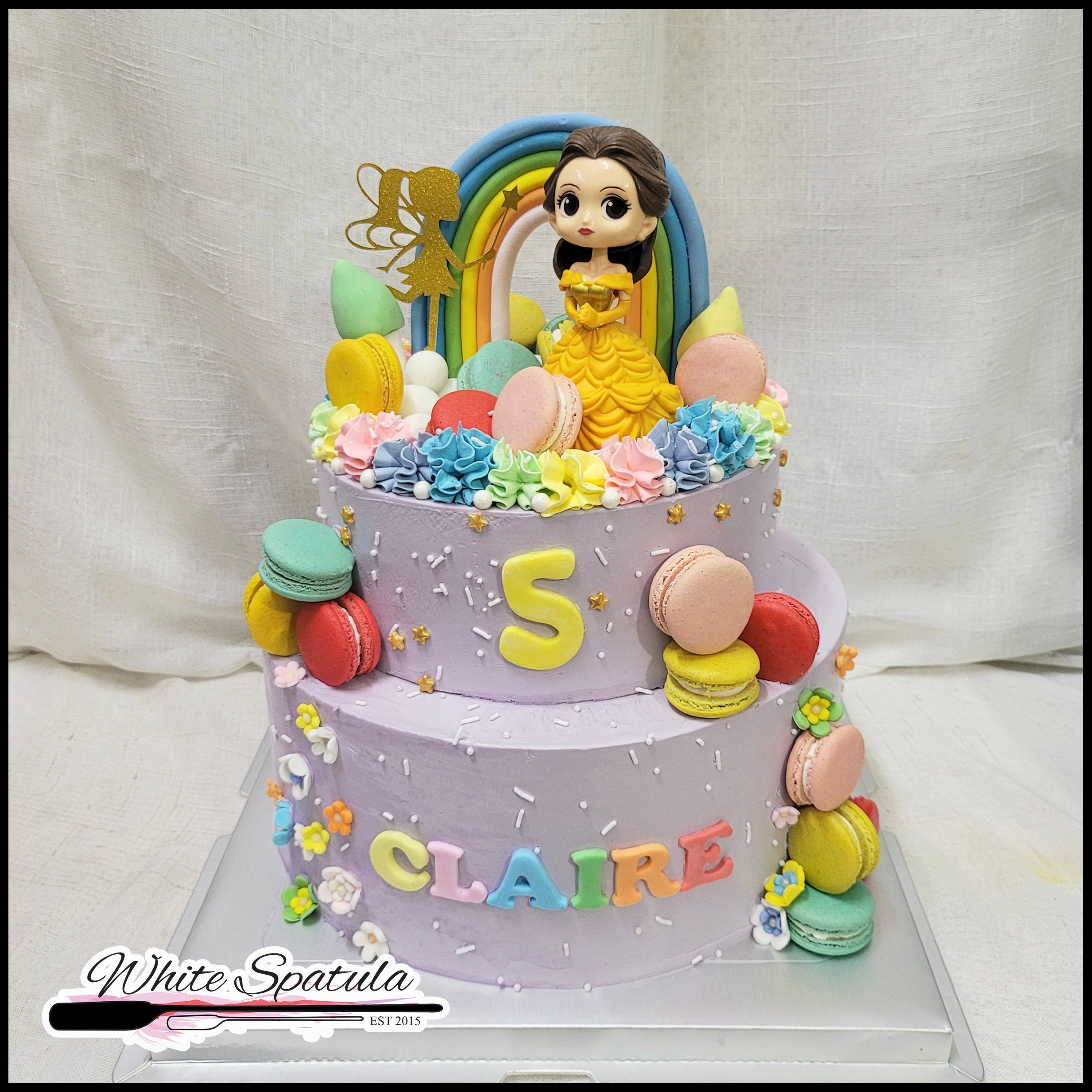 This cake is frosted with a smooth and not-so-sweet vanilla buttercream with a Princess Belle's topper and a classic rainbow colors in pastel! Fondant age and name will be provided.