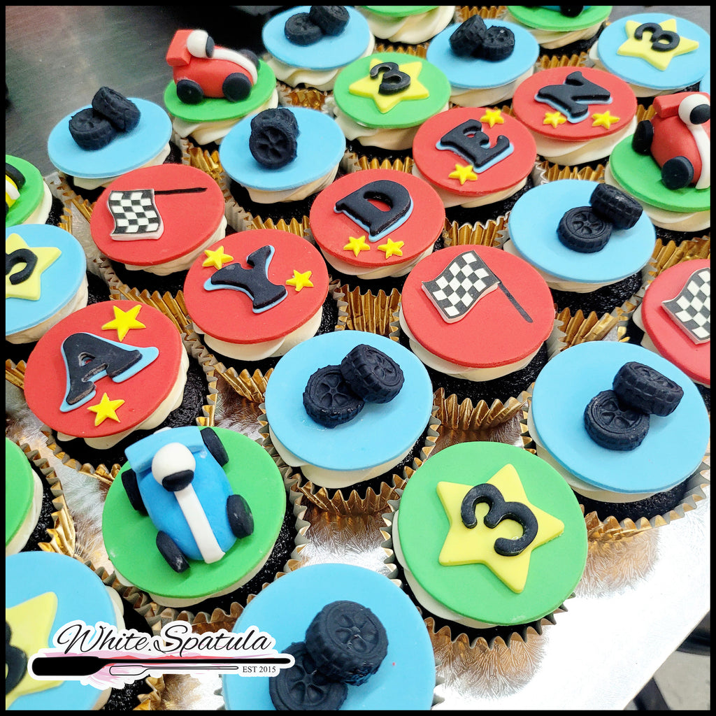Our Racing Cars cupcakes cake are pretty, delicious, and a hit with both kids and adults alike! Topped with a light and smooth rainbow buttercream (most importantly, less sweet!), this is a bite into happiness. Each cupcakes are hand-piped meticulously that will brighten every party.