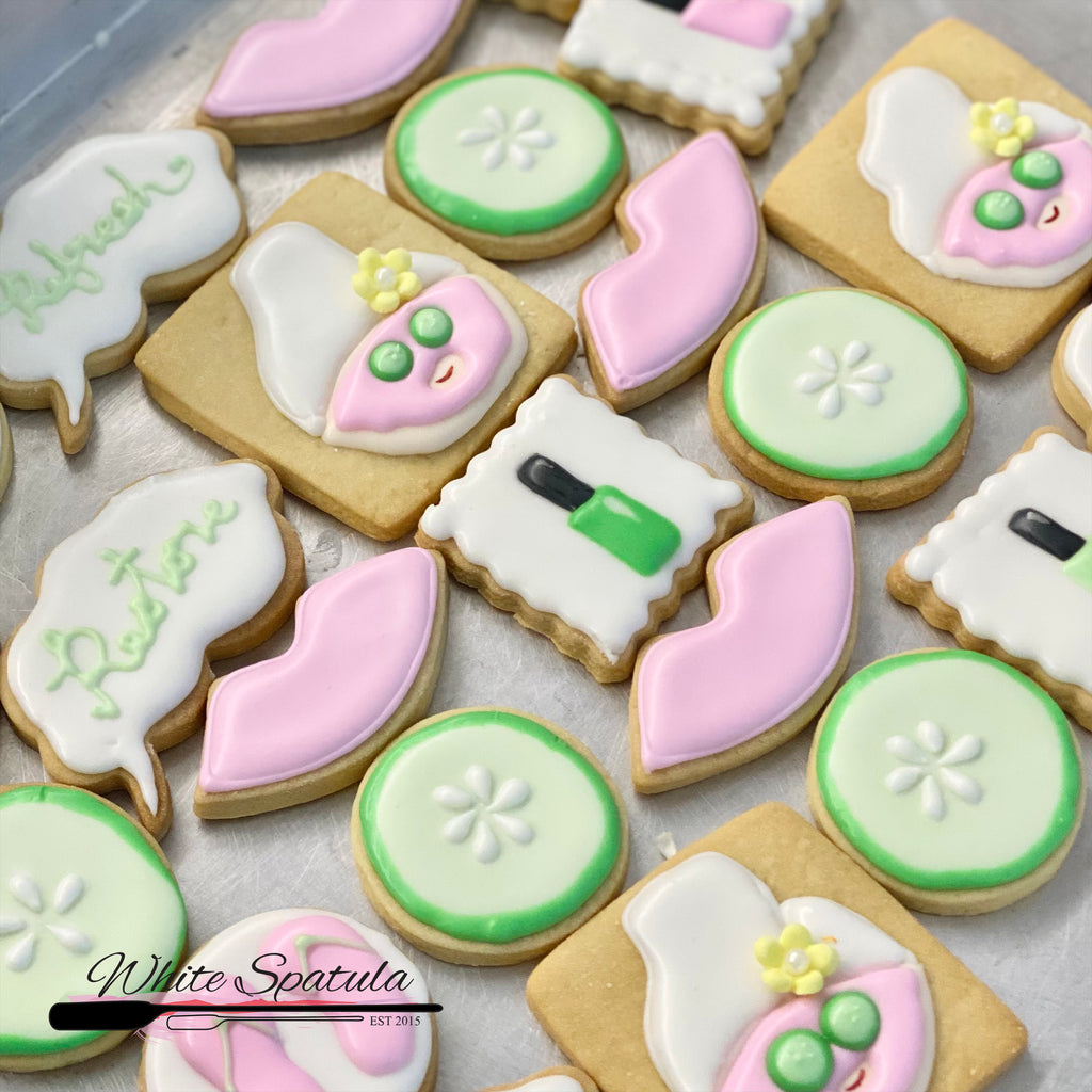 Our classic butter sugar cookies coated with royal icing design! Have a spa at home or a Spa themed party!. Great on a dessert table, or as door gifts/party favours!