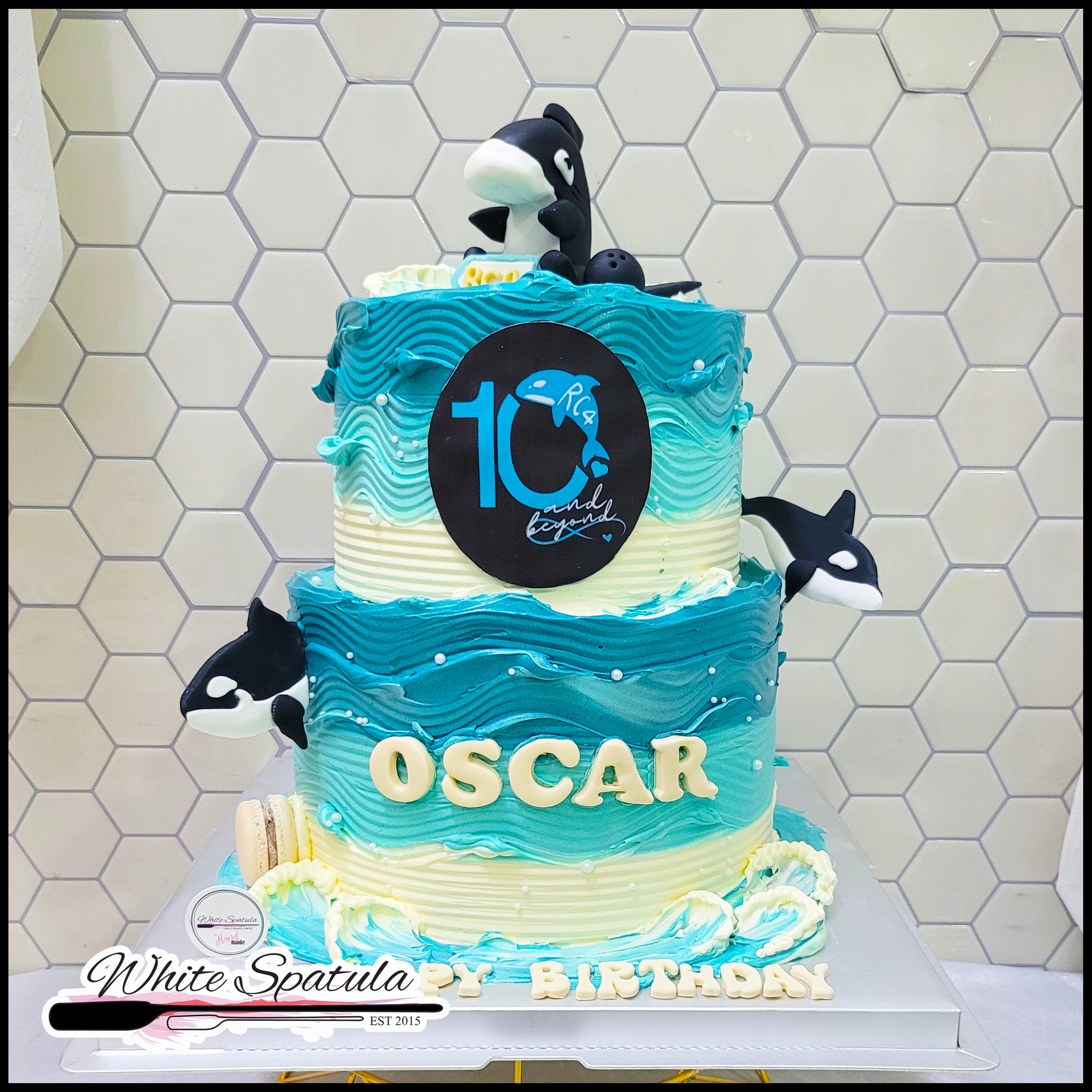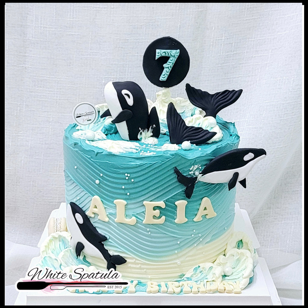 This cake is iced with a smooth and not-so-sweet vanilla buttercream and comes with 3D Whales. Fondant name and age are included as well.