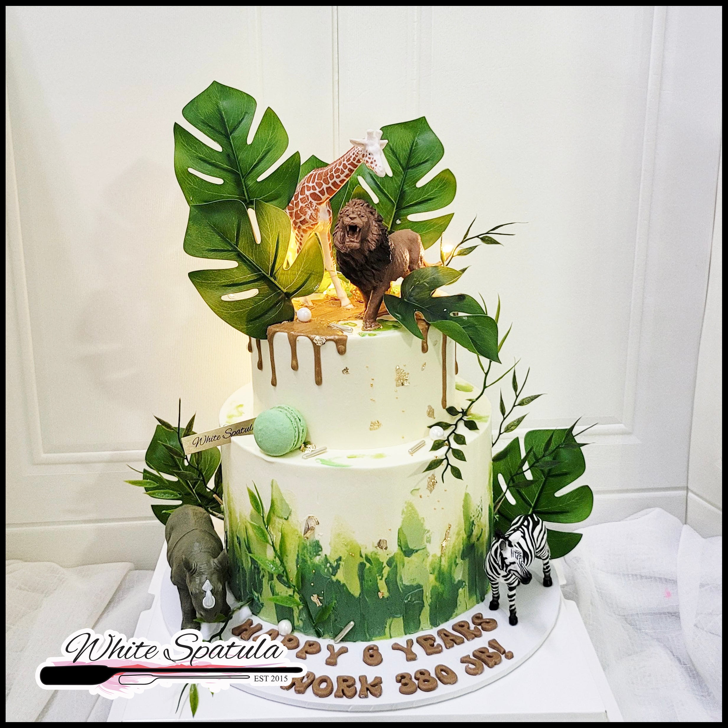 This cake is iced with a smooth and not-so-sweet vanilla buttercream and comes with animal figurines that you can keep as a toy after the party! Please do note that animal figurines will be random